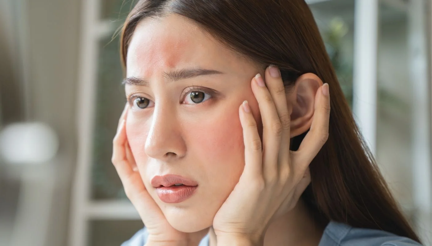 - Persistent facial redness or flushing, especially on the cheeks, nose, and forehead.
