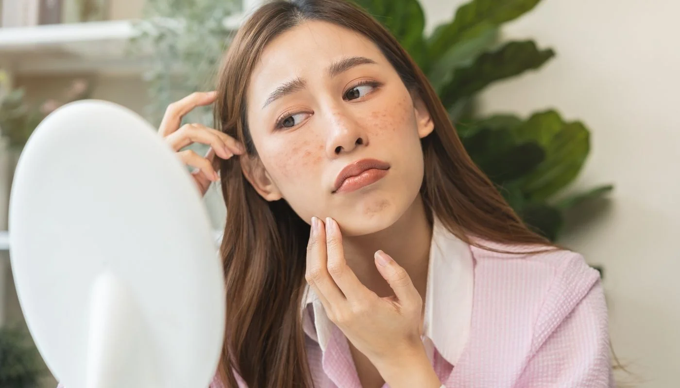 - Uneven skin tone or dark patches, especially on cheeks, forehead, and upper lip.